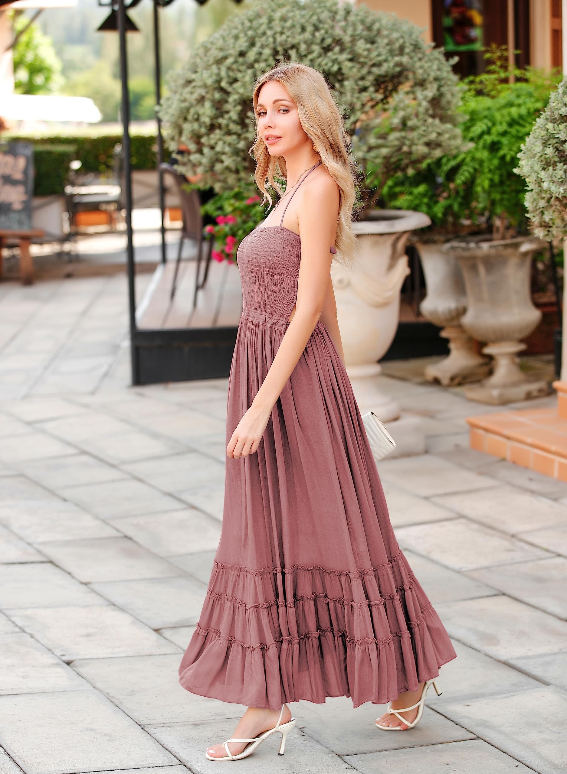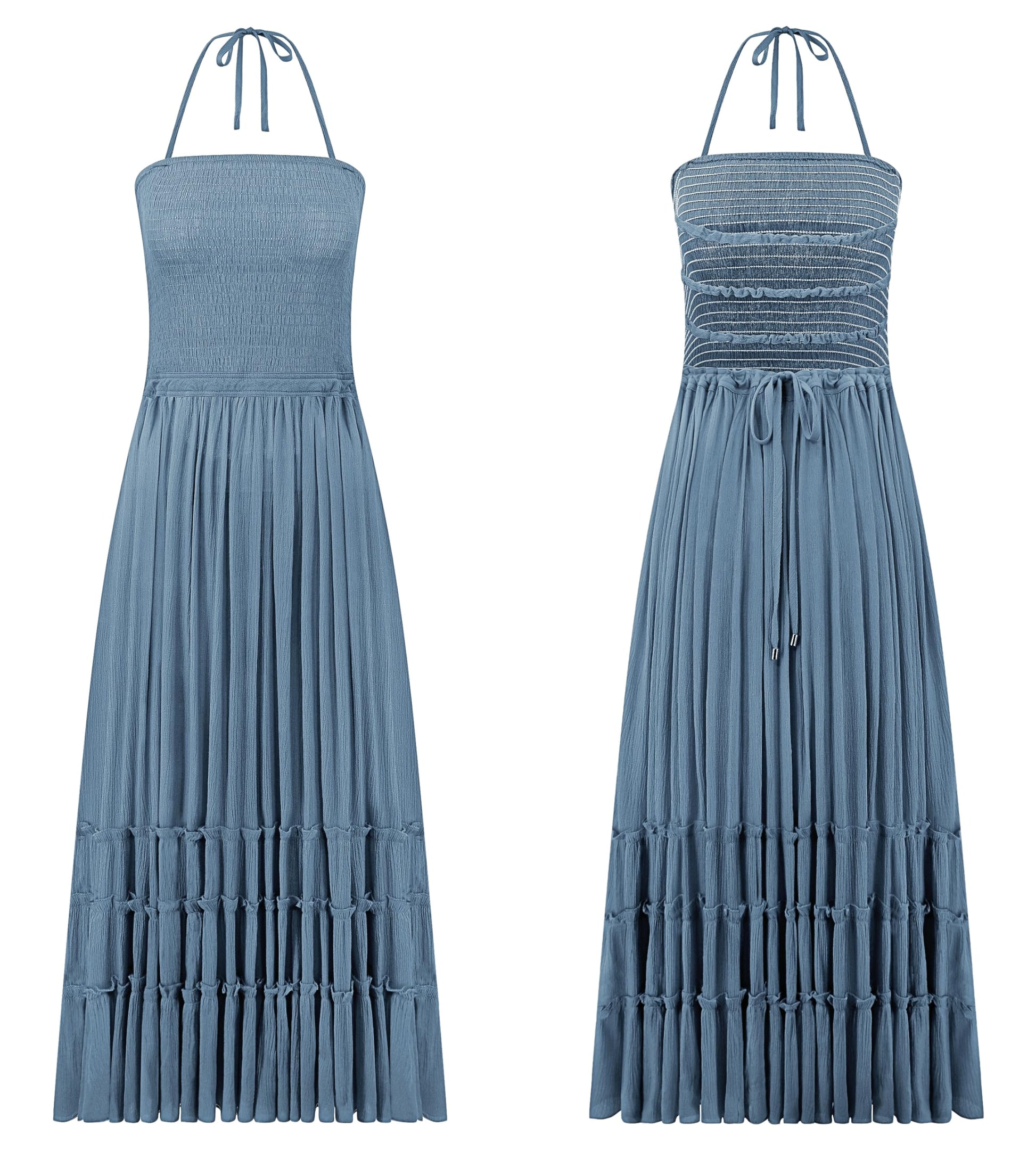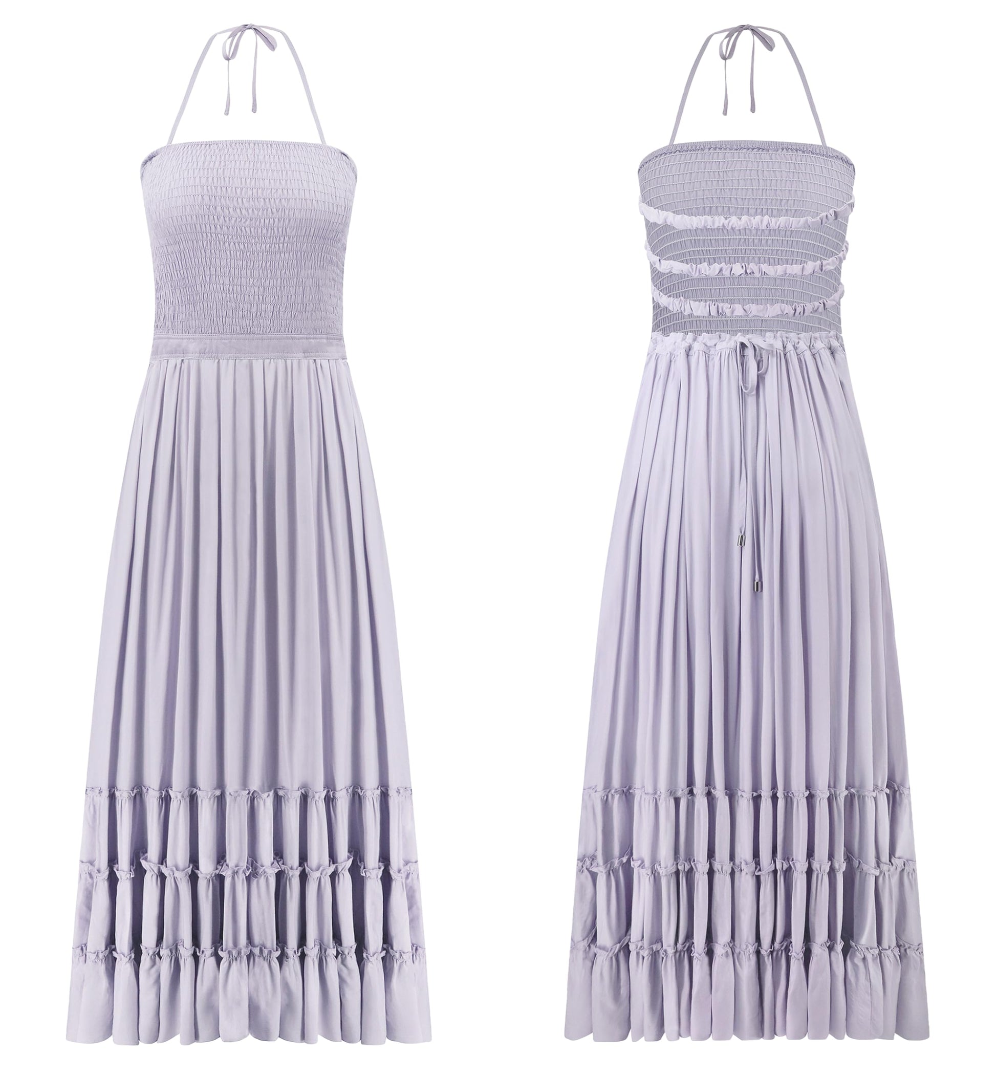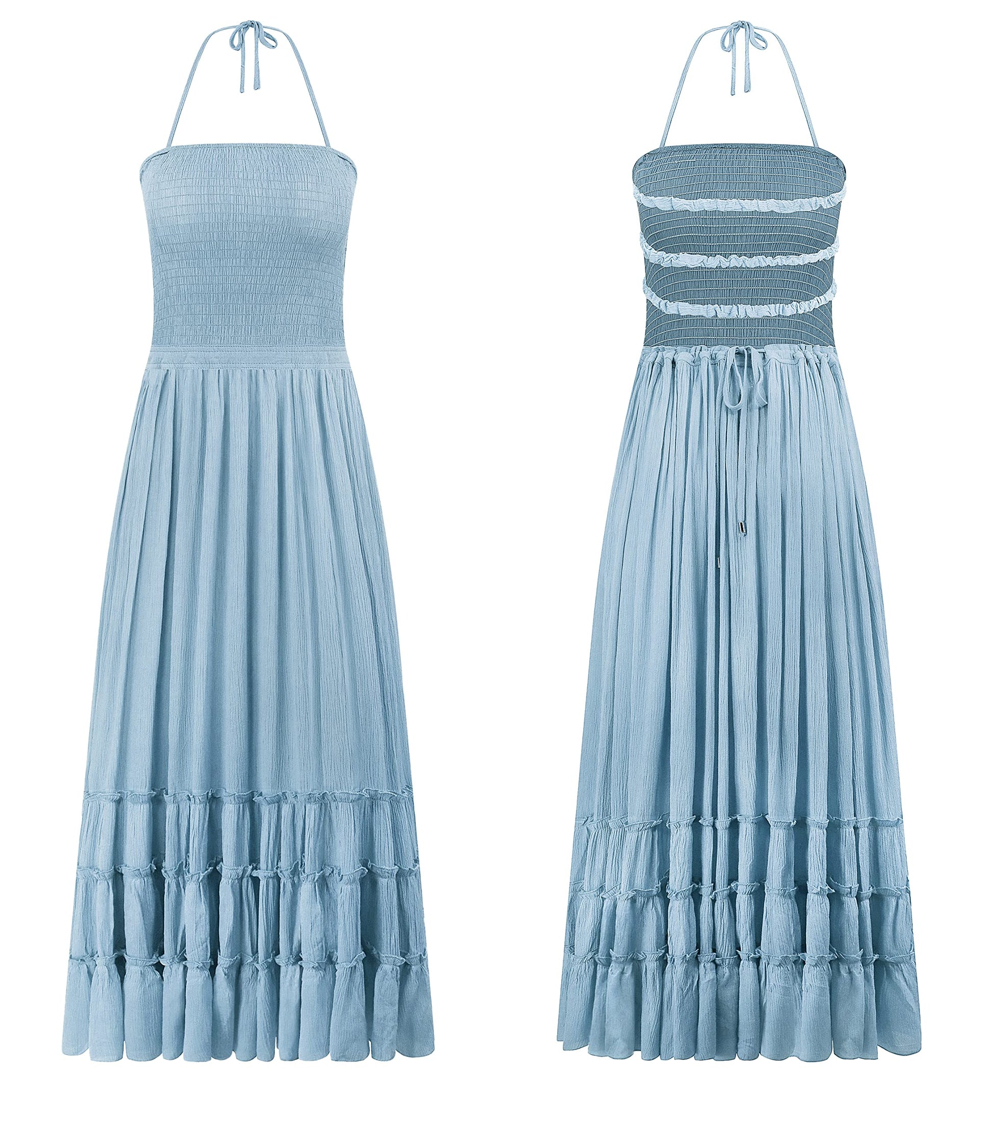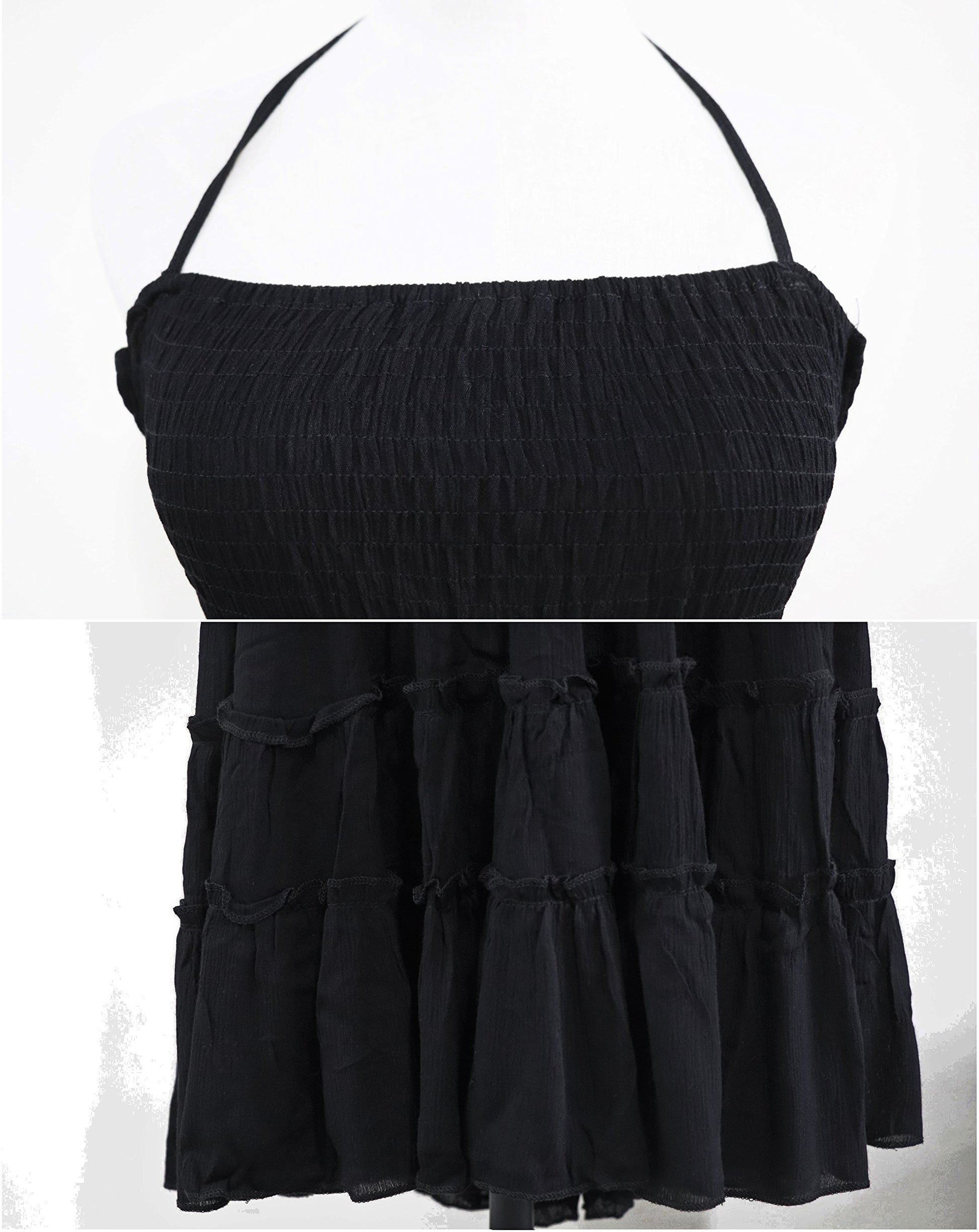 - It Features a Shirred Elastic Bodice, Halter Neck Tie, Backless Design, and a Ruffle Hemline.