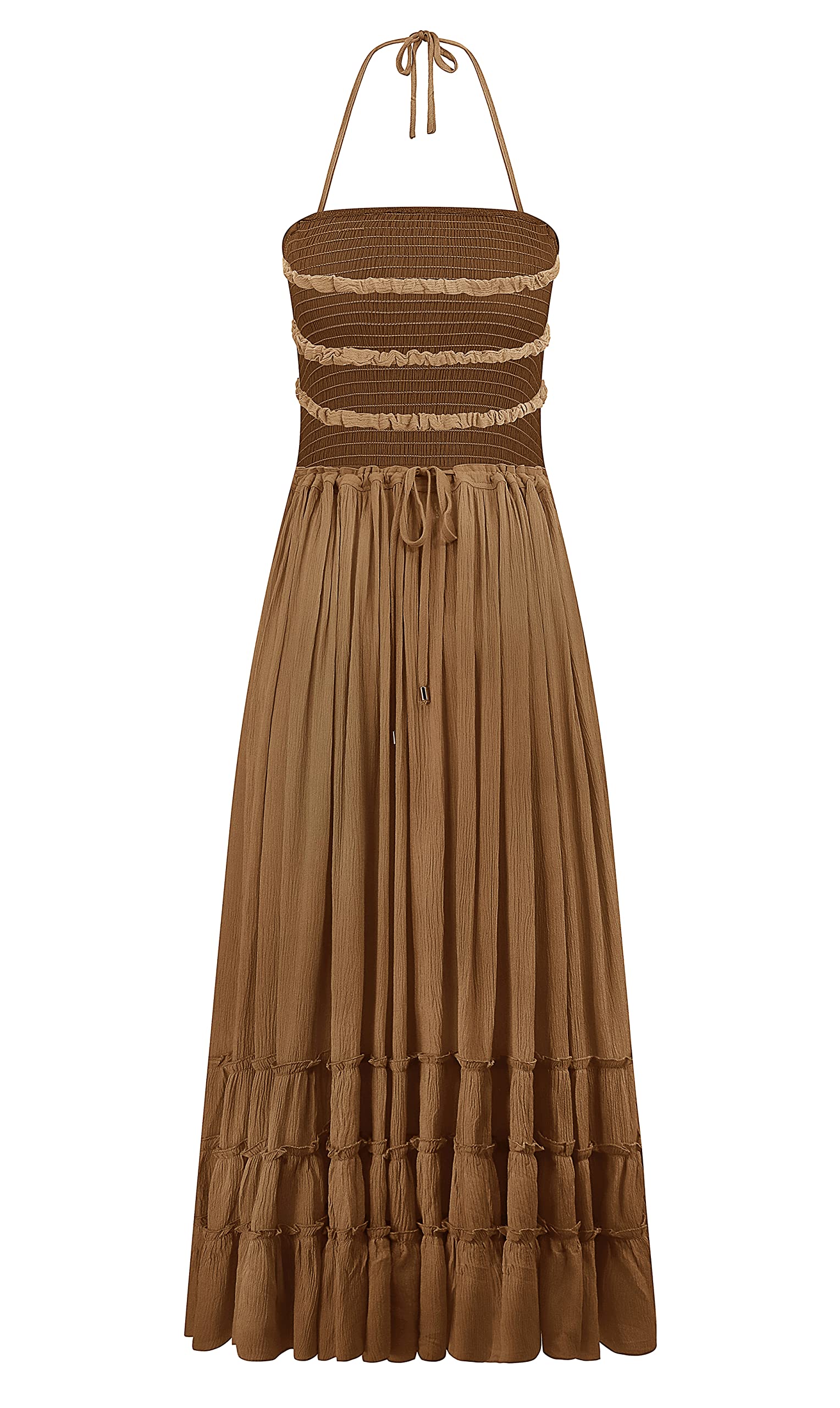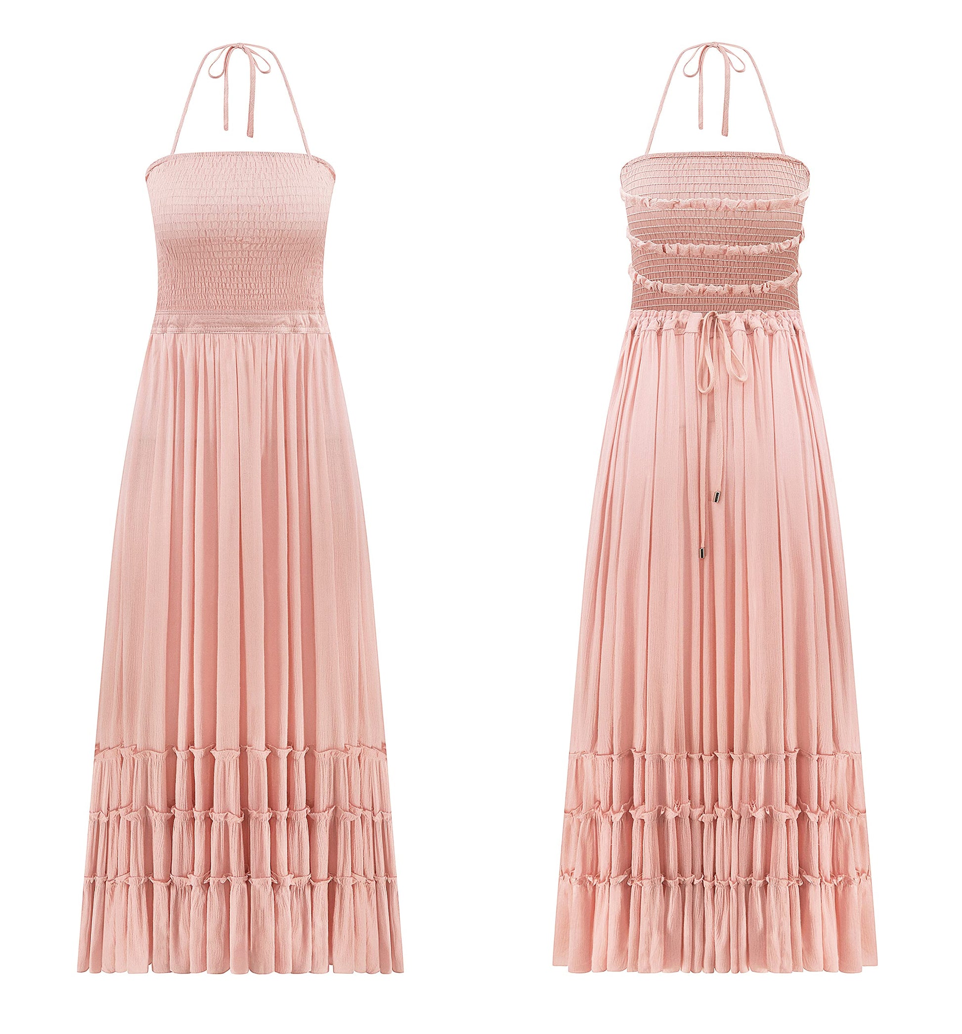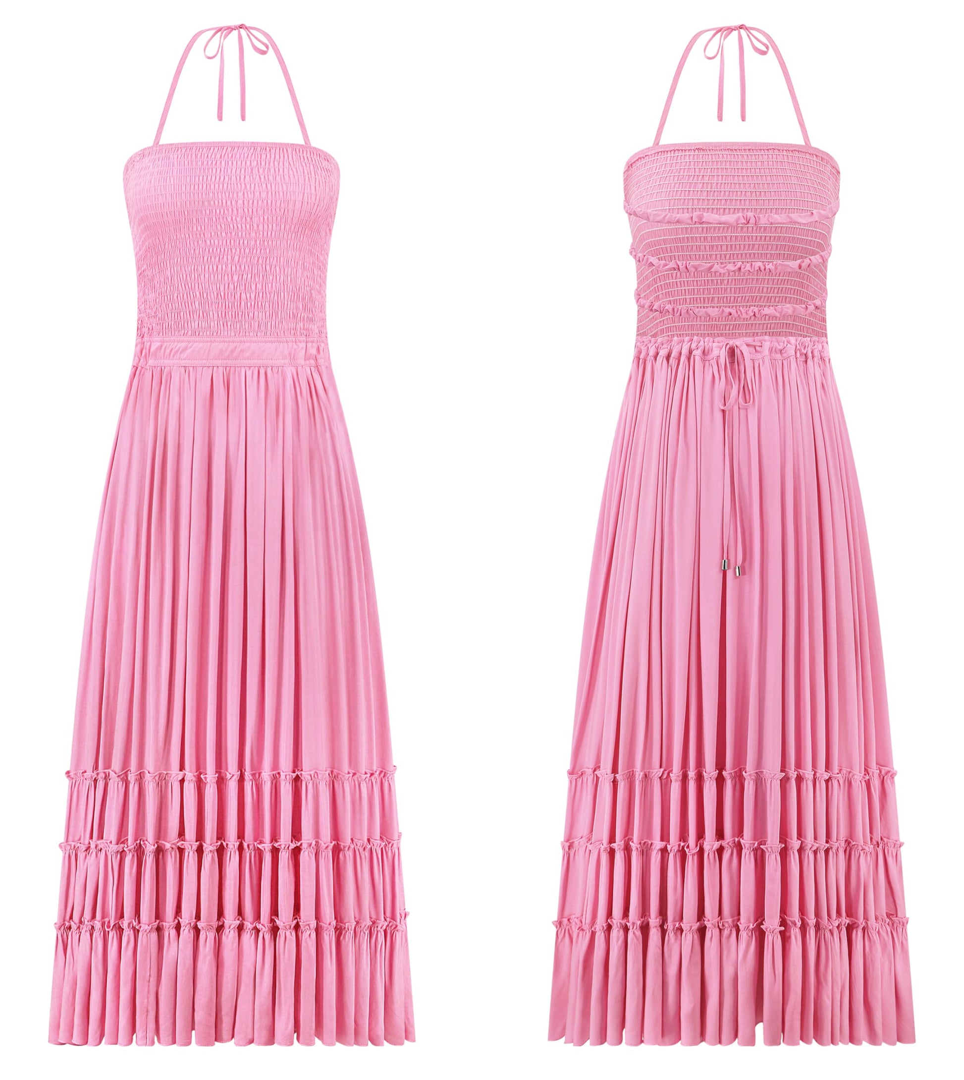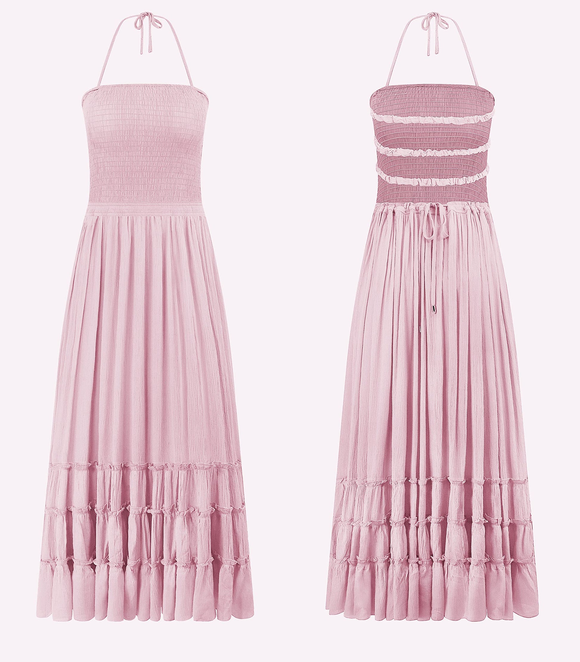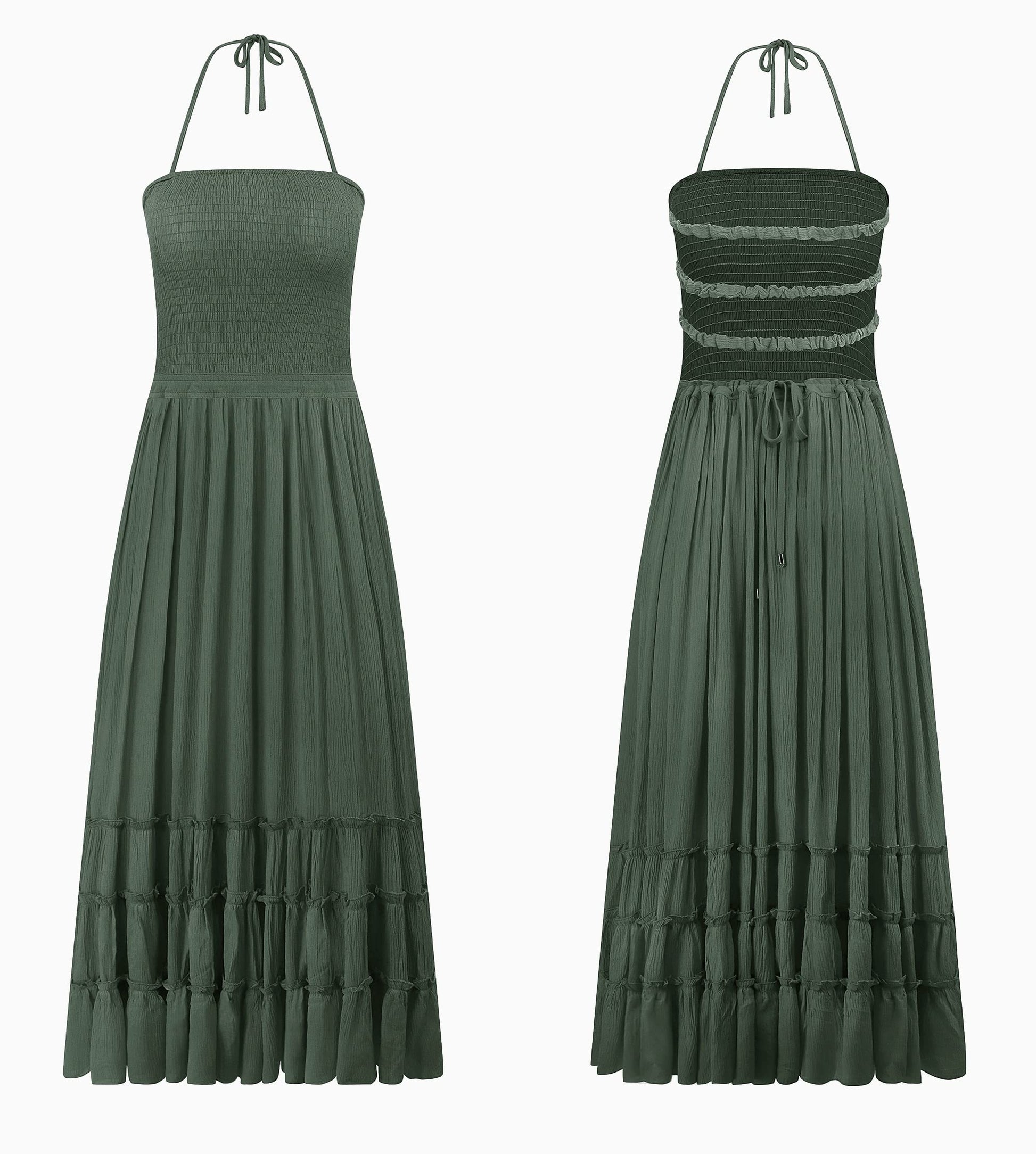 - It Features a Shirred Elastic Bodice, Halter Neck Tie, Backless Design, and a Ruffle Hemline.