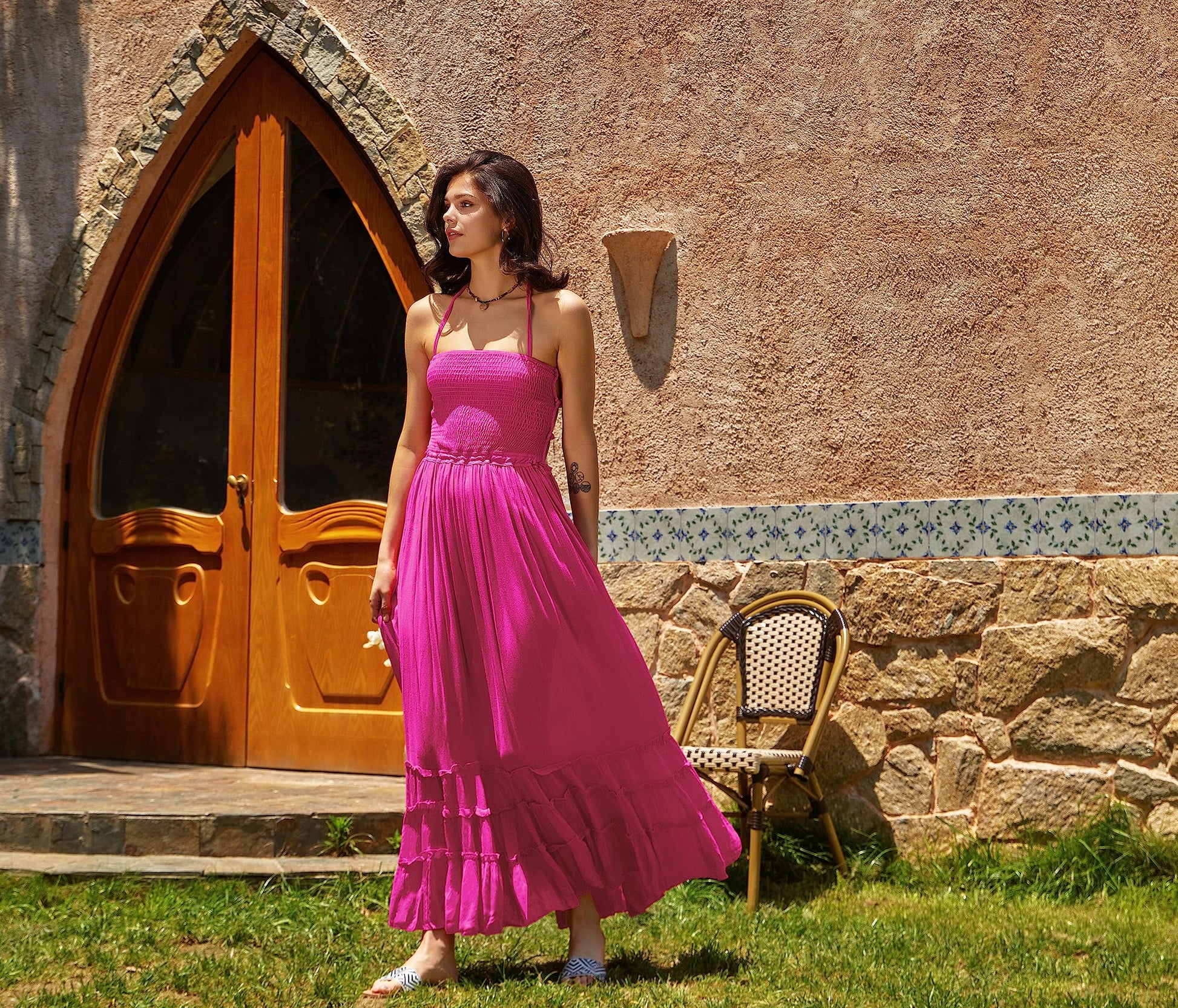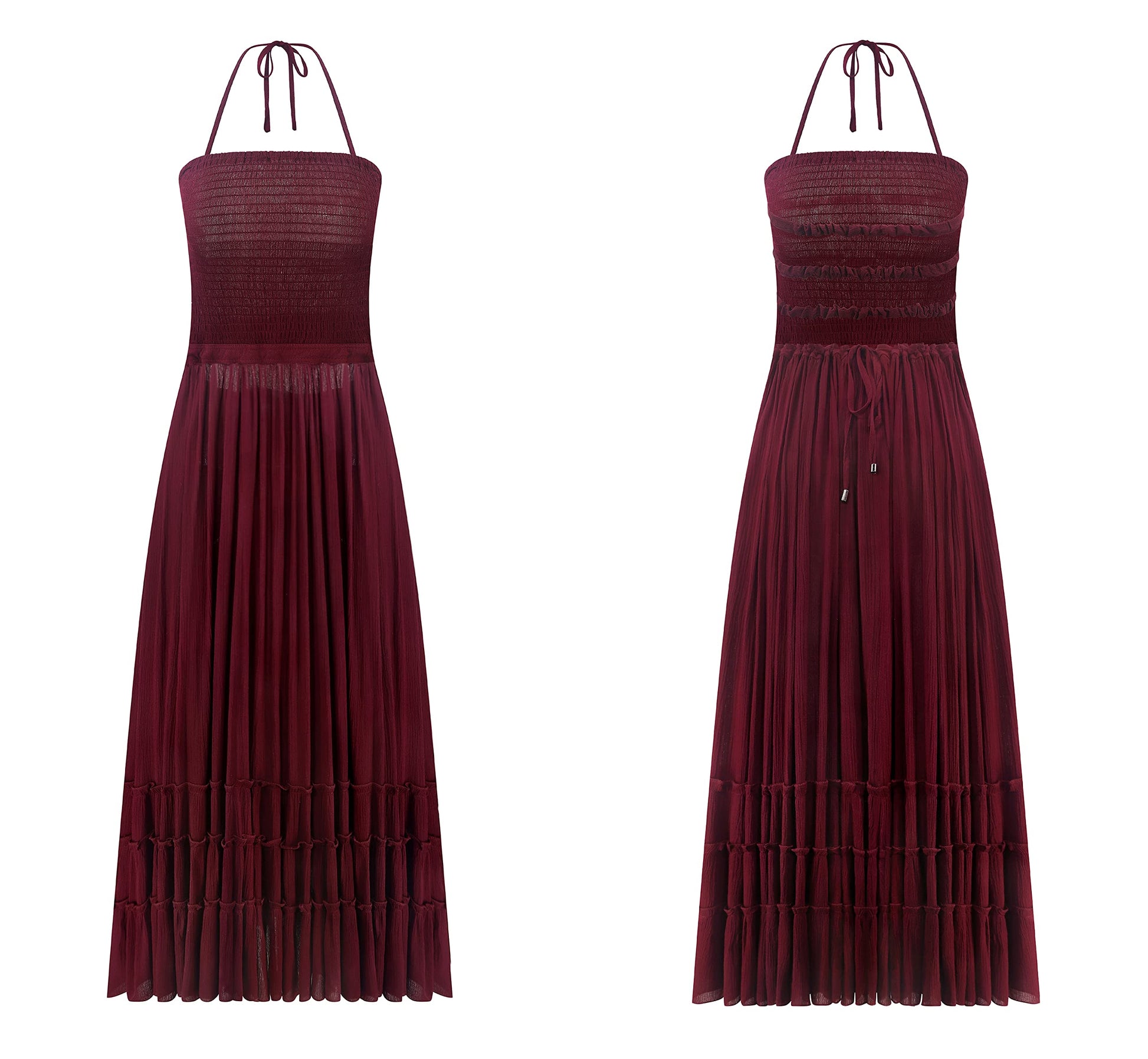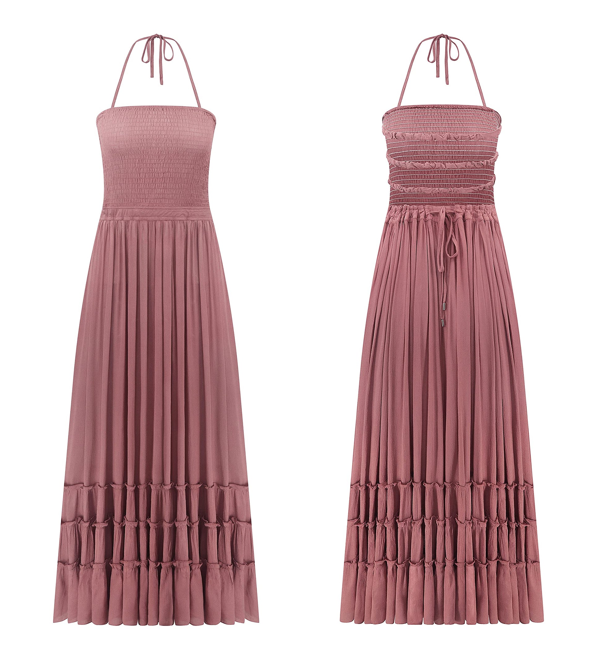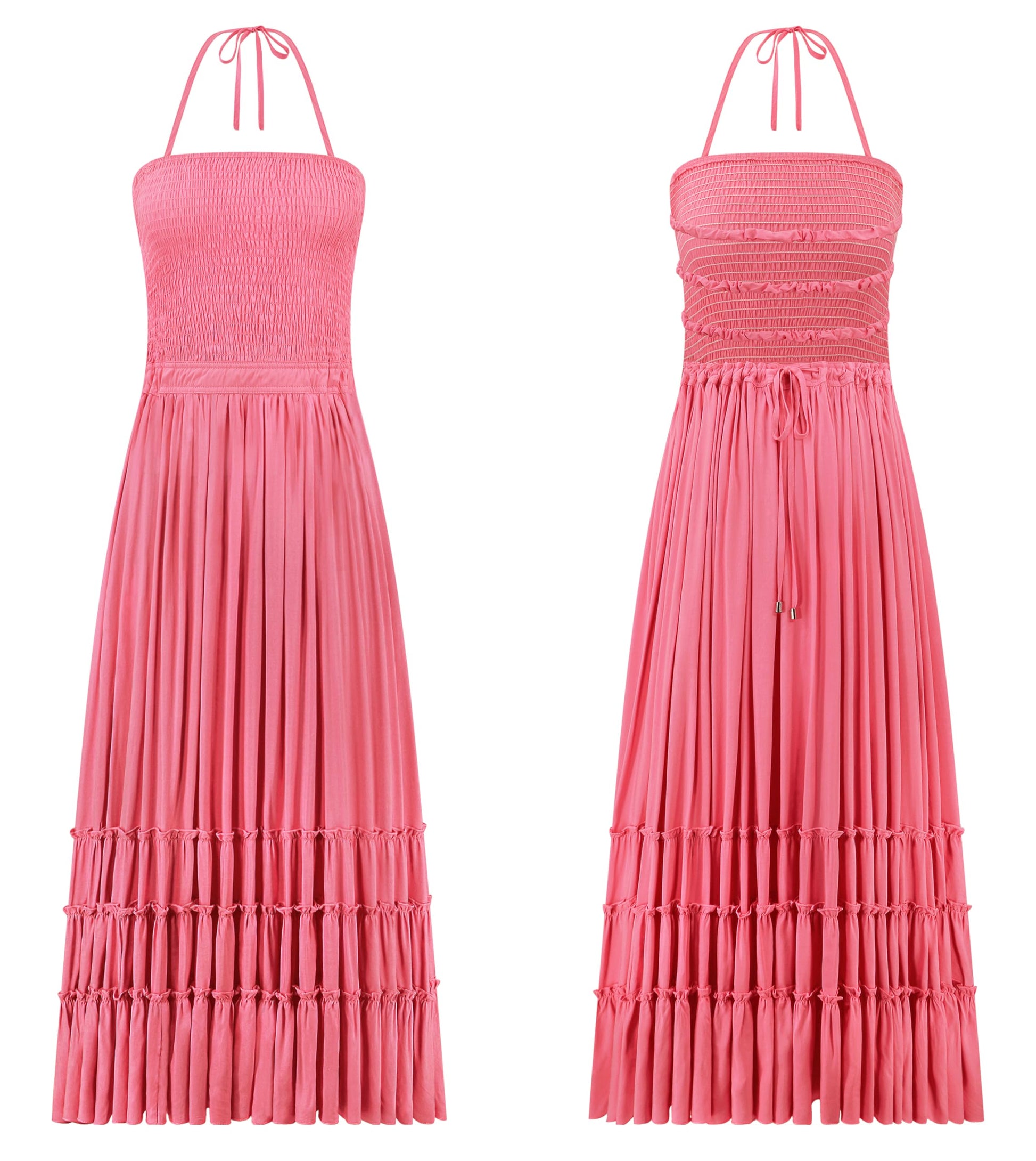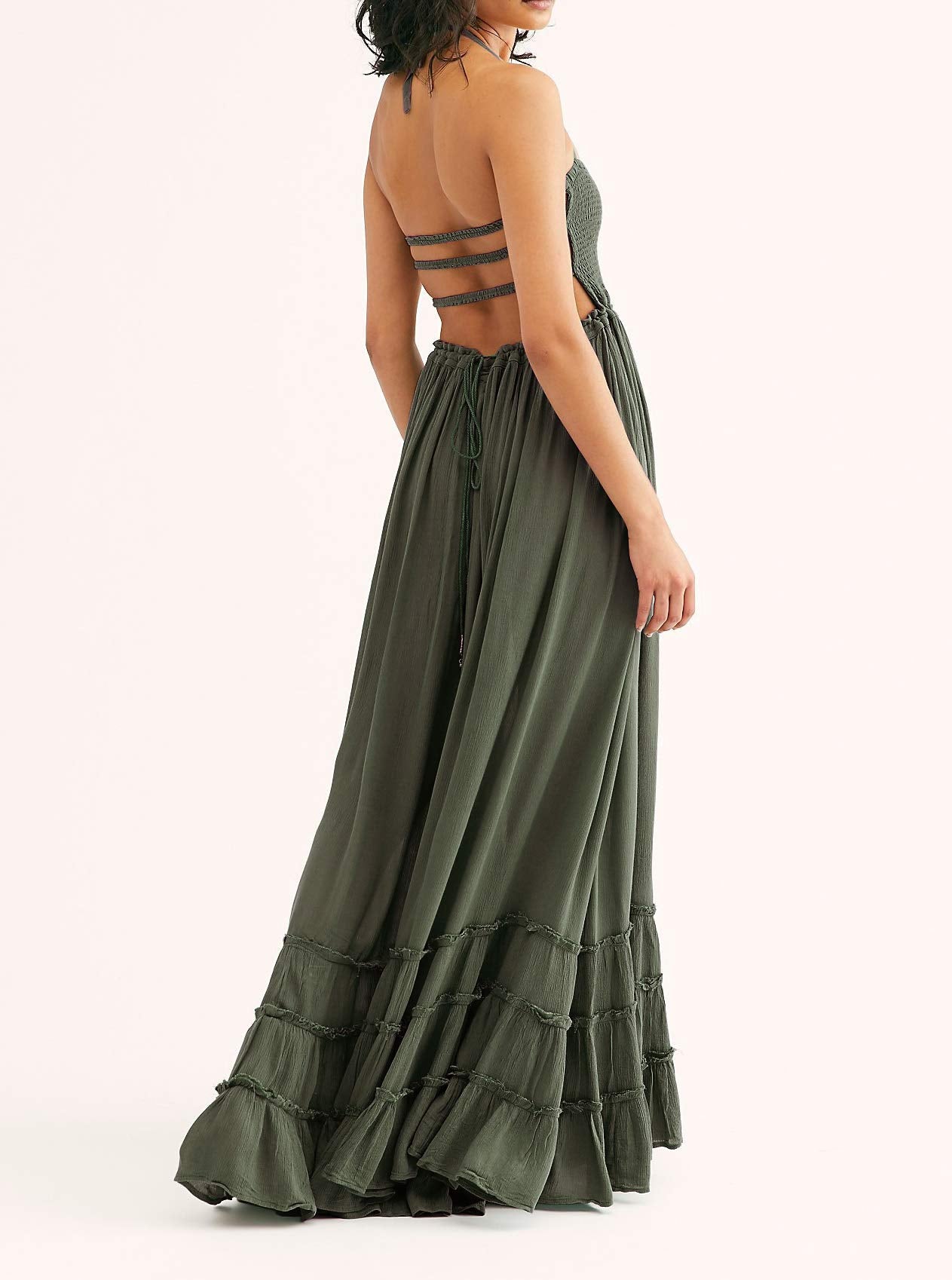 - It Features a Shirred Elastic Bodice, Halter Neck Tie, Backless Design, and a Ruffle Hemline.