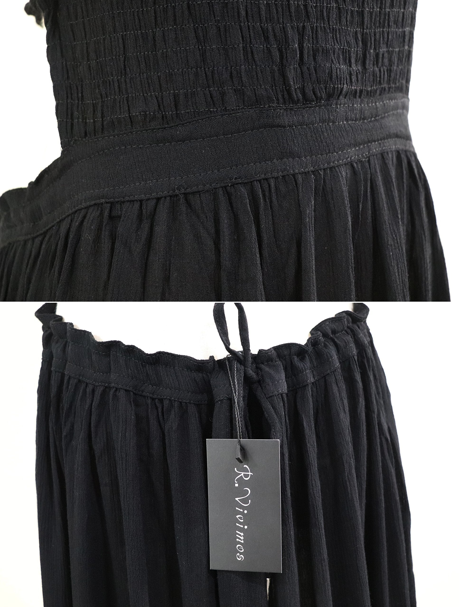 Adjustable Tie | Asymmetrical Layered Hem | Ruffle Slit Flowy Hem | Elastic Waist | Elastic Smocked Top | Low Back Waist | Elastic Waist |