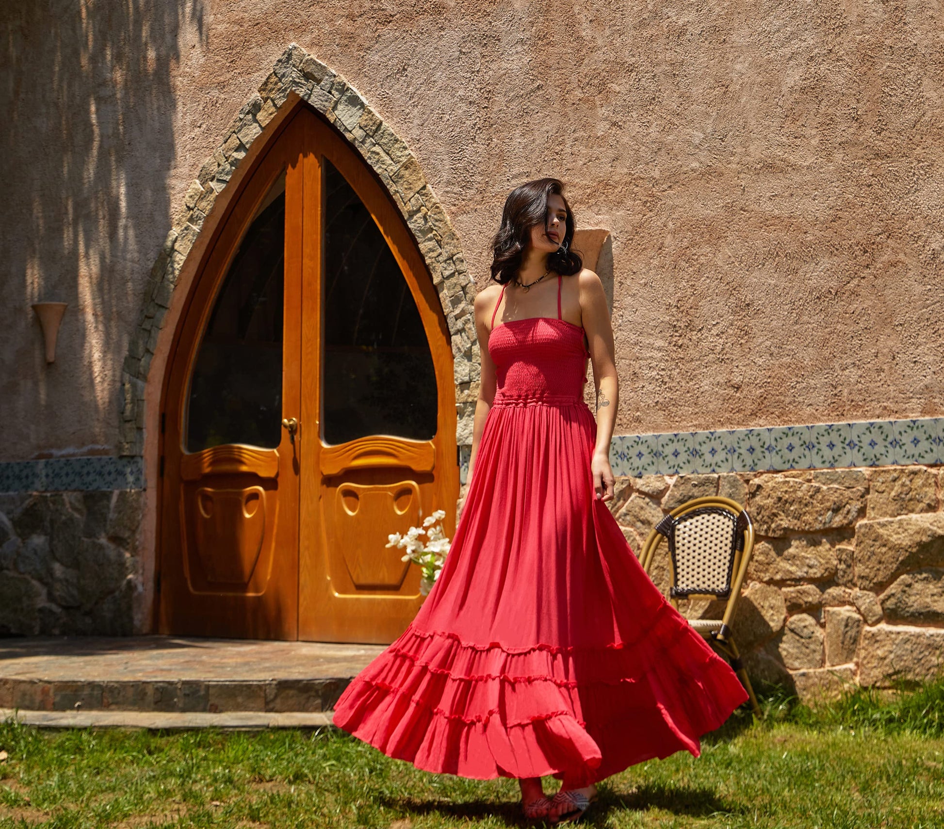 - The tiered ruffle maxi silhouette is not only trendy but also flattering;